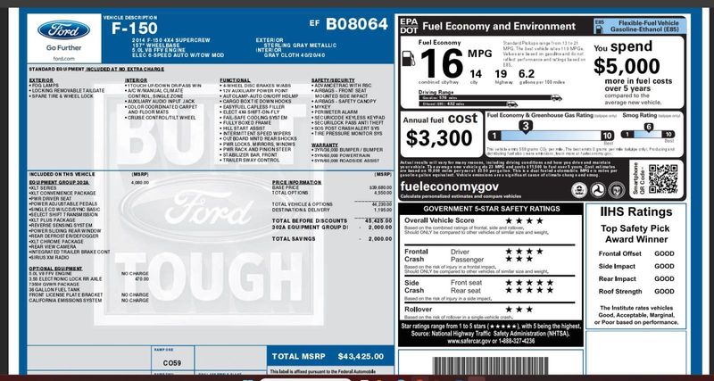 ENGINE: 5.0L V8 FFV, EQUIPMENT GROUP 302A LUXURY, ELECTRONIC LOCKING W/3.55 AXLE RATIO, STERLING GRAY METALLIC, XLT CHROME PACKAGE, XLT CONVENIENCE PACKAGE, XLT PLUS PACKAGE, TRAILER TOW PACKAGE, TRAILER BRAKE CONTROLLER, 5" CHROME RUNNING BOARDS, SIRIUSXM SATELLITE RADIO, REAR VIEW CAMERA, REVERSE SENSING SYSTEM